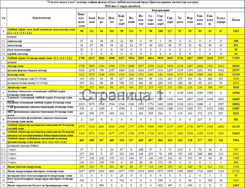 Отчет о деятельности выездных медико-социальных бригад Международного благотворительного фонда «Sog‘lom avlod uchun» в разрезе областей за I квартал 2026 года