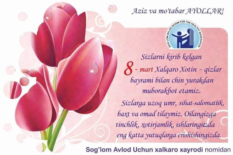 Коллектив Фонда «Соғлом авлод учун» сердечно поздравляет вас с Международным женским днём! Желаем крепкого здоровья, счастья, весеннего настроения и благополучия. Пусть каждый день приносит радость, тепло и вдохновение!