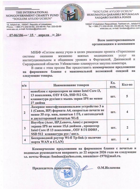 МНФ «Соғлом авлод учун» томонидан «Фарғона, Жиззах ва Сирдарё вилоятларида институционал ва жамоа даражасида ҳаётий муҳим тиббий хизматлар кўрсатиш тизимини мустаҳкамлаш» лойиҳасини амалга ошириш доирасида инвентар харид қилиш режалаштирилмоқда.